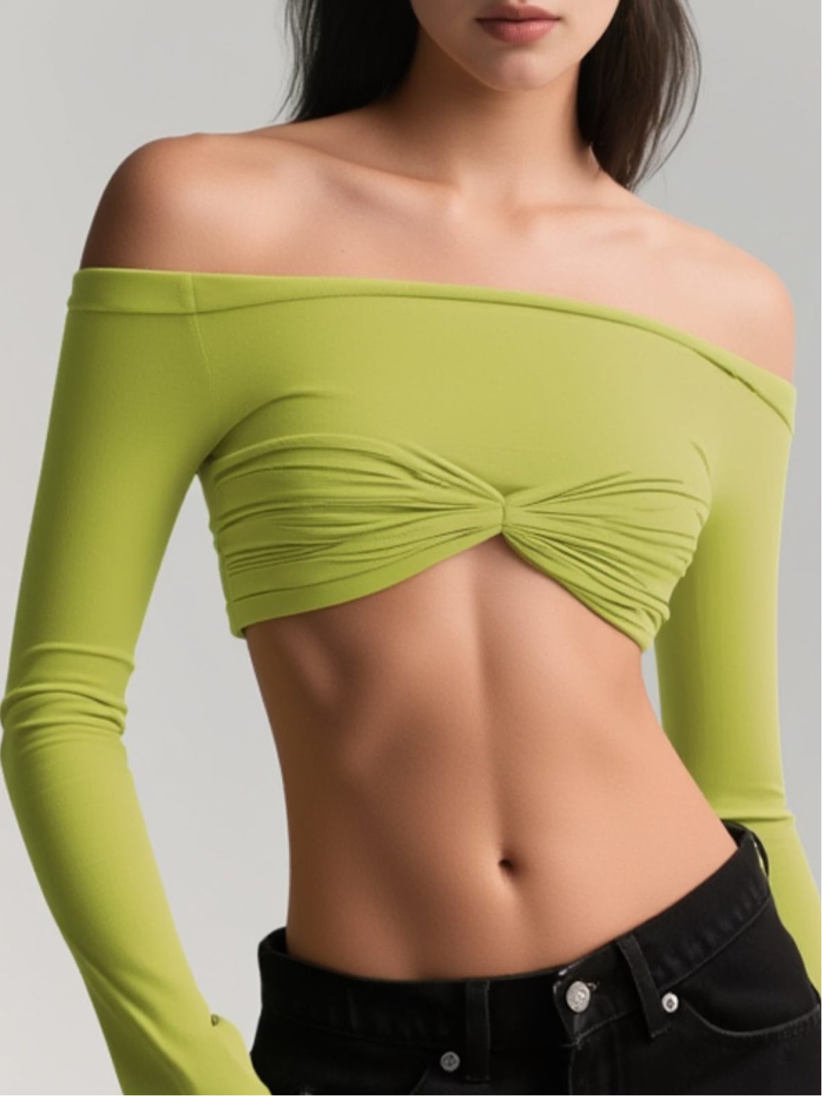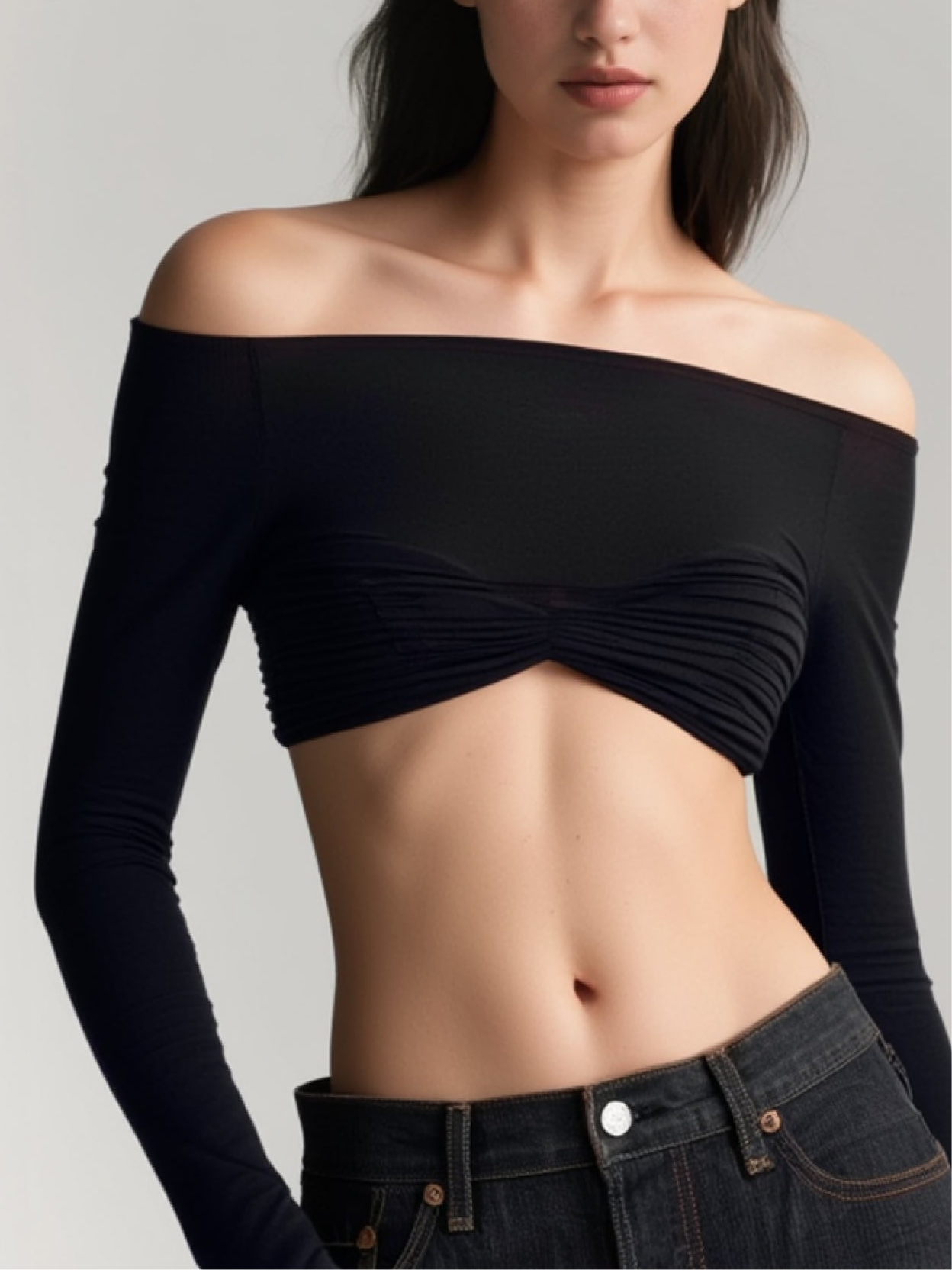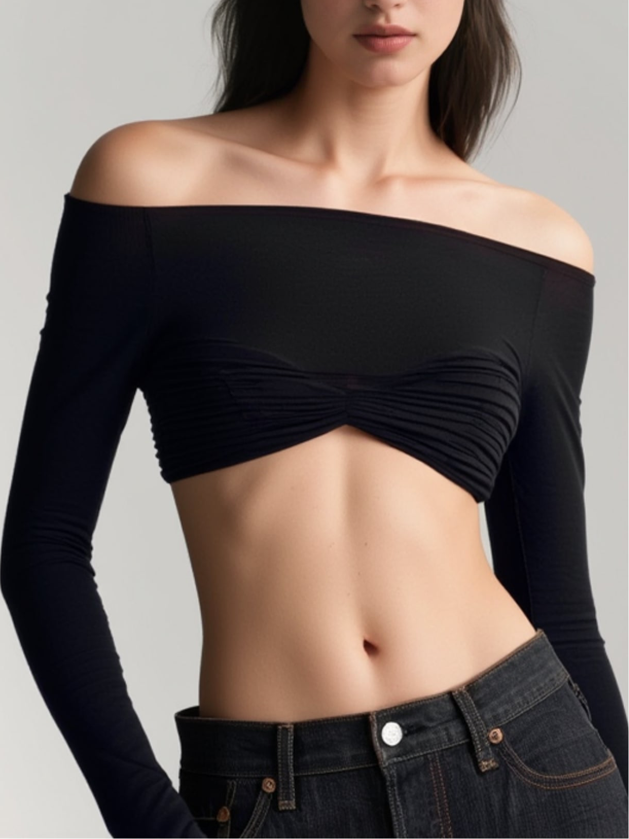 Color: Blanco - Negro - NudeEstilo: CasualTipo de Estampado: LisoDetalles: dos tejidos coordinadosTipo: Top cortoEscote: cuello bandejaLongitud de la Manga: manga largaLongitud: Corto